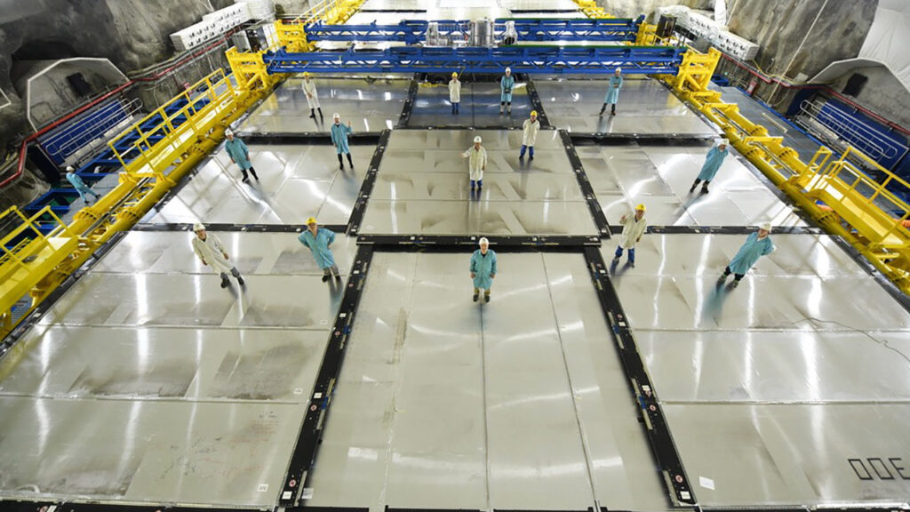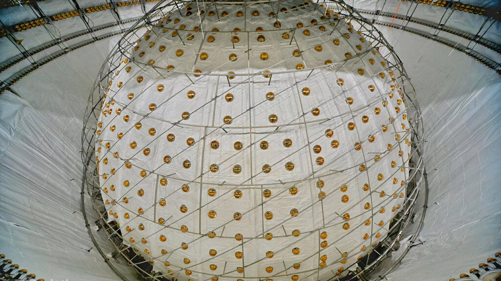 JUNO sits 700 meters underground to shield it from cosmic radiation, with its core being a 35.4-meter-diameter acrylic sphere holding 20,000 tons of linear alkyl benzene, a specialized liquid. When a neutrino—particularly antineutrinos from nearby nuclear reactors—interacts with this liquid, it emits a faint blue flash. Surrounding the sphere are 43,200 photomultiplier tubes (PMTs), each with highly sensitive detectors that capture these flashes and convert them into electrical signals for scientists to analyze. The sphere floats inside a 44-meter-deep pool of ultra-pure water, monitored by 2,400 extra PMTs that filter out cosmic muons. JUNO is 20 times larger than any previous detector of its type.