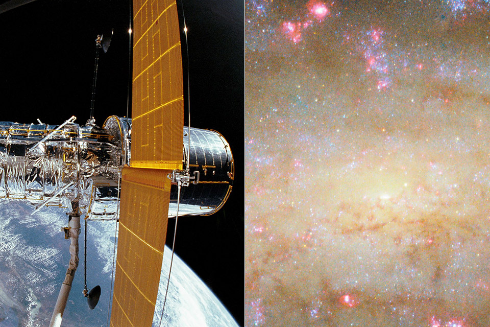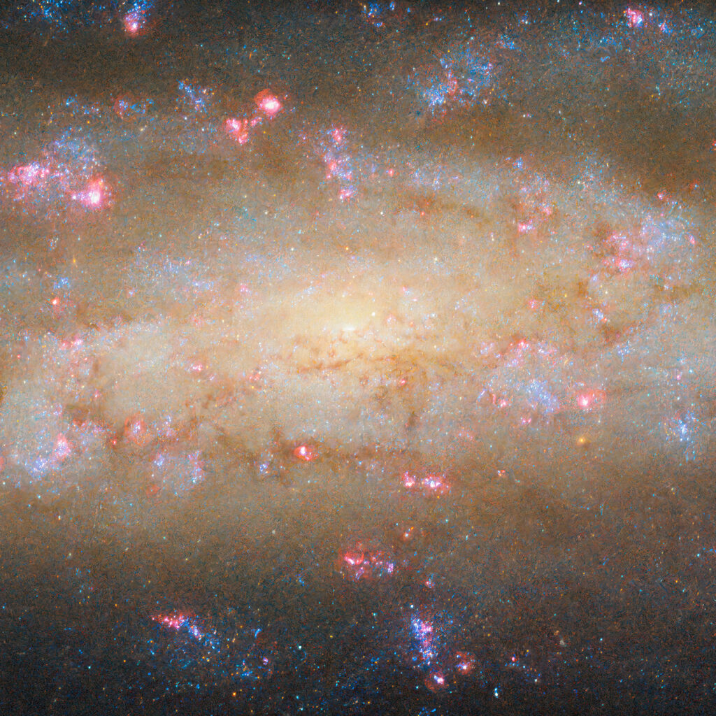 Bright pink regions scattered along the arms mark star-forming zones, where clouds of gas collapse to create new stars. Seen through Hubble’s H-alpha and NII filters at 657 nanometers, these stellar nurseries glow red. Each of these pockets is a site of intense creation, transforming gas into stars that will shine for billions of years.